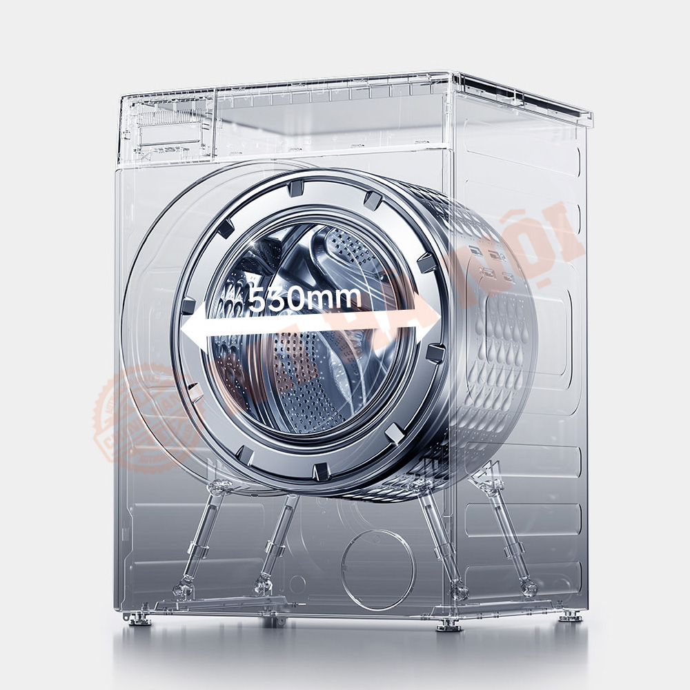 Đường kính lồng giặt 530mm cho phép quần áo được đánh trong lồng giặt với đường đi dài hơn và lực ly tâm lớn hơn. Quần áo được nhào trộn để giặt kỹ hơn, đạt tỷ lệ làm sạch cực cao 1.1, vượt xa tỷ lệ giặt sạch thông thường.